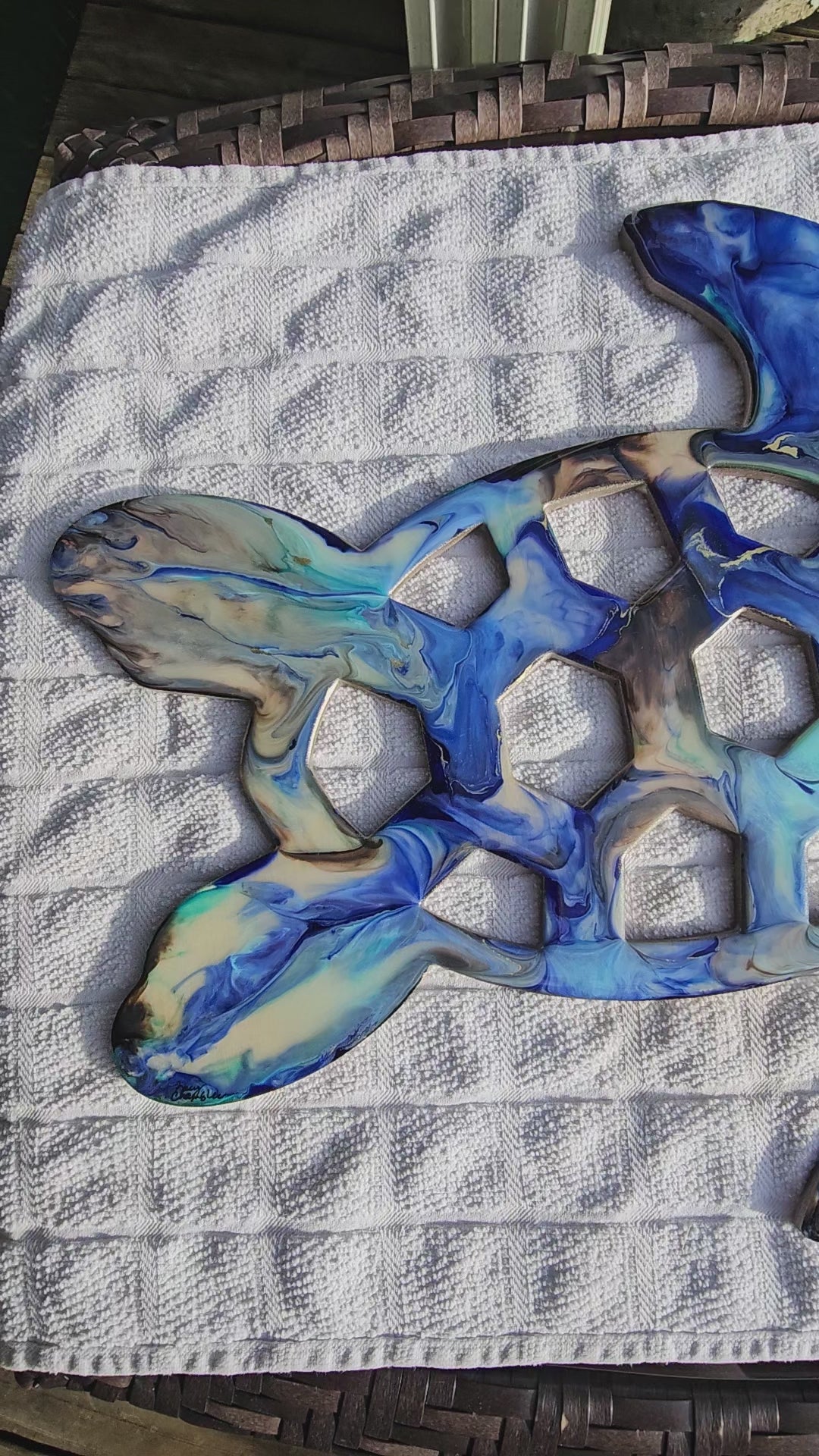 This stunning sea turtle wall decoration adds a touch of coastal to any space. Handcrafted with beautiful flowy lavender blues, brown and accented with gold metallics. It measures 16.25" w x 13" h x .25" thick. Featuring a painted back and wire hanger, it's a unique and tasteful addition to your home decor. Mix and match with other pieces for a one-of-a-kind beach-inspired look. Indoor use only.