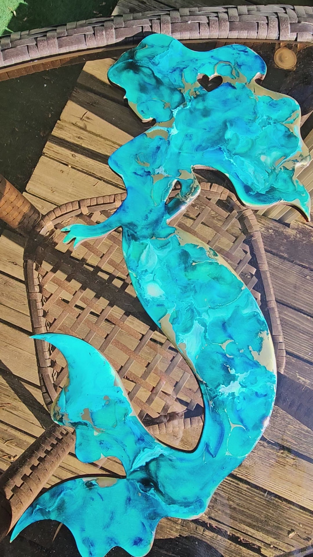 Decorate your beach house with beautiful handmade resin on wood art. Featuring bright colors all accented with gold or silver metallic accents.  This beachy mermaid has flowy hair with a heart cutout in her hair. Made with 1/4" wood laser cutout.  Original art contemporary mermaid will look beautiful on your beach house walls!  Measures approximately 16" x 8" at the widest point.  The back and sides are painted.  Wire hanger on the back. Recommended for indoor use only.