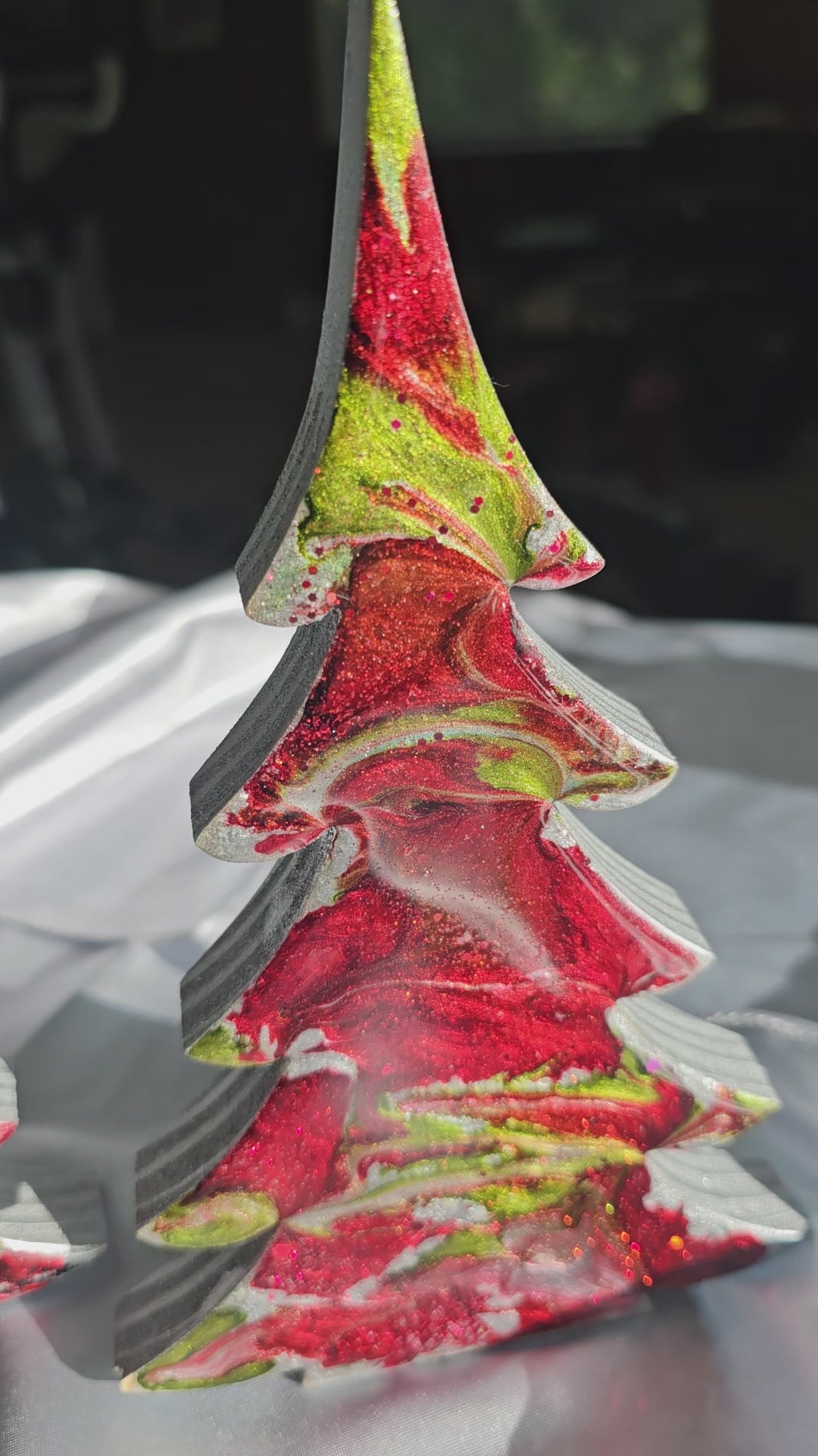 Handmade contemporary style hand cut wood Christmas trees with resin. Handcrafted with chunky wood and beautiful gemtone red and green resin, accented with silver shimmer plus glitter in the resin. Makes a beautiful mantel piece scene. Back and sides are painted silver with a hint of glitter. The trees measure medium 8 inches tall. Complete with a signature by the artist on the piece, these trees are a true work of art. Resin and wood may contain slight imperfections. Indoor use.