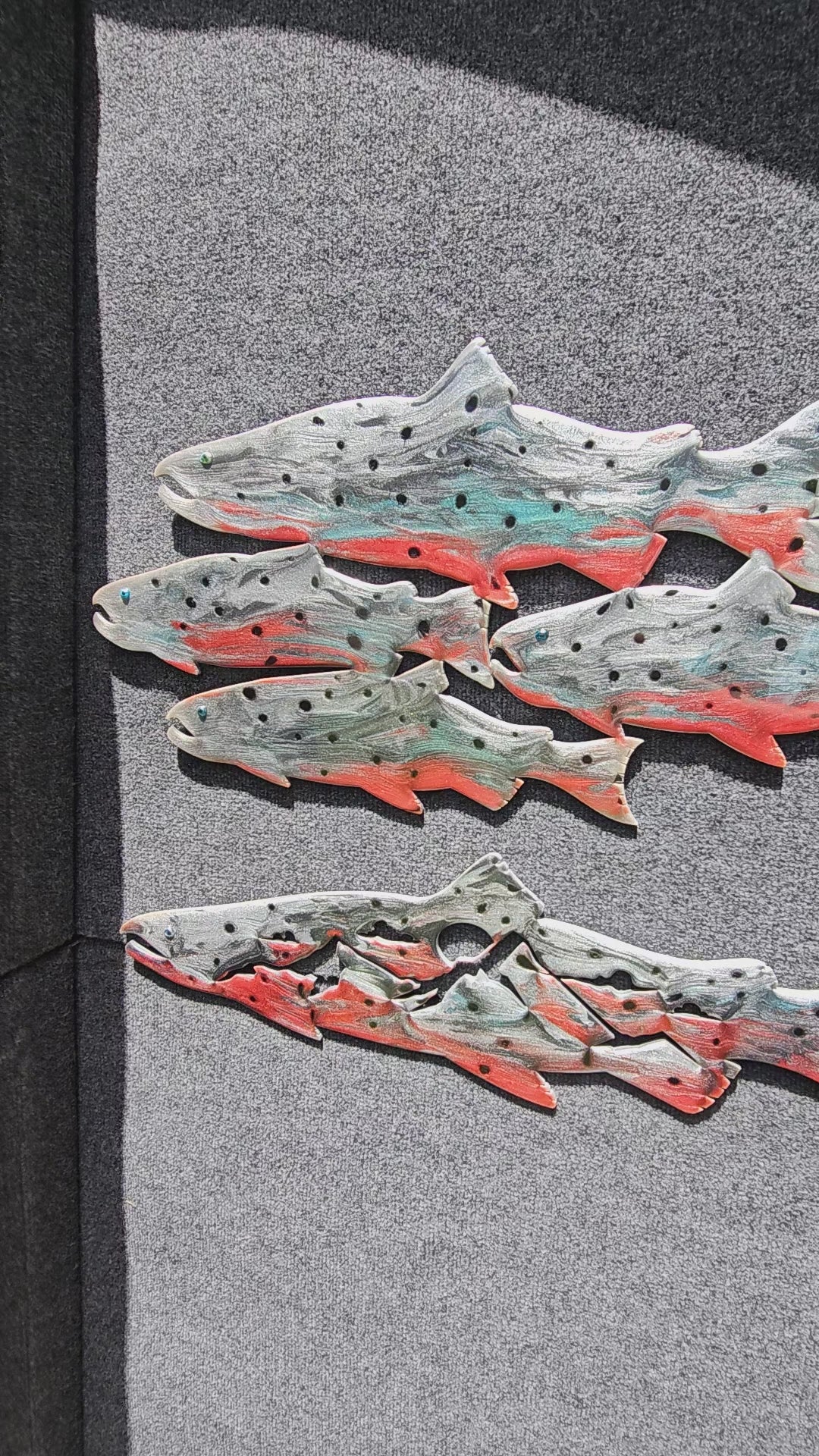 Northwest wilderness school of Chinook salmon fish, one-of-a-kind, handcrafted wall decor. Laser cut with lightweight plywood with handcrafted resin overlay. These original pieces features shimmery silvers, grays, blues and greens with hints of red and typical black spotted details. Eyes are resin chips embedded into the piece in varying colors. Three pieces to choose from each with their own unique color variations. Measures approx 28.5" long x 13.5" tall x .25" thick. Its wire hanger allows for easy wall hanging, making it a perfect addition to your sophisticated cabin decor. Indoor only.