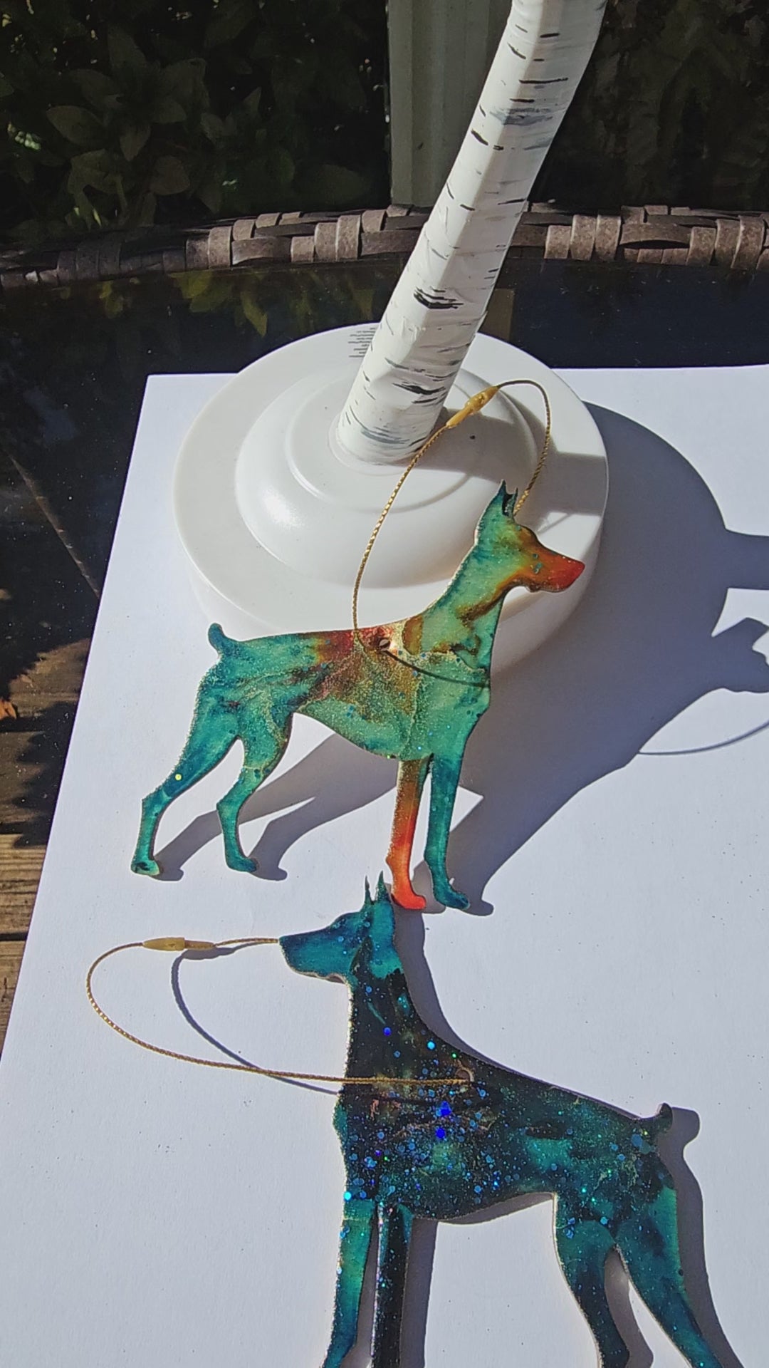 Add some puppy love to your Christmas tree with our handmade Doberman Pincer Dog ornaments! Crafted with lightweight wood and colorful resin, these sparkly decorations feature metallic and glitter accents. Sure to delight and make your furry friend wag their tail! Hangs from a metallic cord and painted on the back. Measures approx. 4" x 4" x 1/8" thick.
