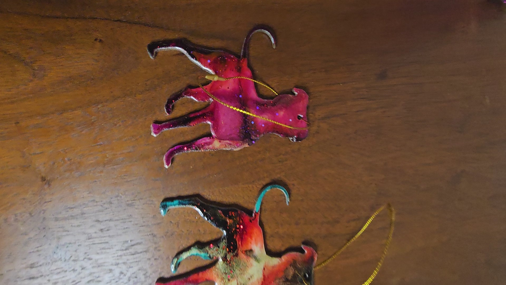 Handcrafted resin and wood pitbull terrier pittie dog breed Christmas ornaments. Handmade with lightweight wood and vividly colored resin. Wood is approximately 1/8" thick and measures 4 inches high x 3 inches wide. Features bright multicolored resins with metallic and/or glitter accents. Listing is for one ornament. Resin and wood may contain slight imperfections.